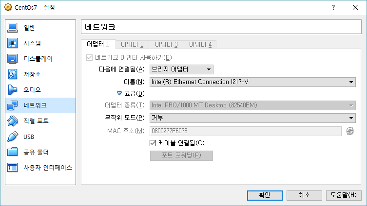 중요2) 리눅스 설치가 완료되면 리눅스를 종료 후 VirtualBox 설정 → 네트워크 에서 NAT 를 브리지 어댑터로 변경한다.