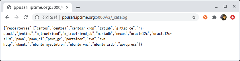 http://ppusari.iptime.org:5000/v2/centos7/tags/list <-- catalog에서 나온 리스트 자세히 검색 (예제는 centos7을 검색)