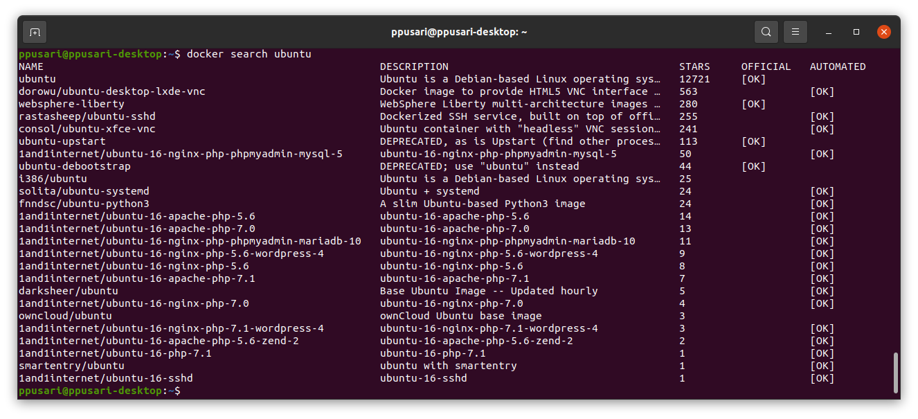 $ docker search ubuntu <-- dockhub 에 있는 이미지를 검색