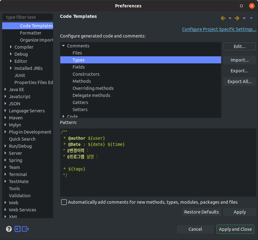 클래스나 맴버 변수 위에서 주석을 입력할 경우 자동으로 입력되도록 항목을 정의할 수 있다.
