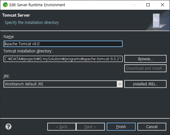 - Windows -> Preferences -> Server -> Runtime Environments -> (서버선택 후) -> Tomcat installation directory: 에 톰캣 경로 변경